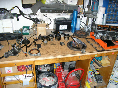 Werkbank mit demontierten Teilen eines GK-Blocks. Kolben, Schwungmasse, Kupplung, Zylinderkopf, Vergaser, Ansaugrohr. Pleuel und Kurbelwelle fehlen